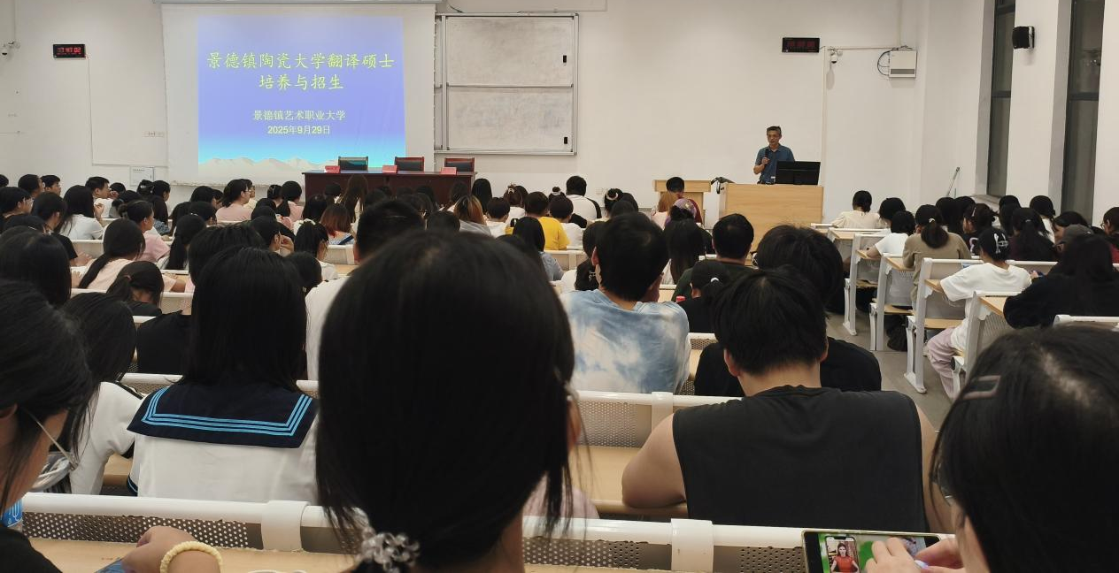 9月29日晚,我院在景德镇艺术职业大学教21栋B102教室进行了2026年硕士研究生招生宣讲。本次宣讲会由我院卢军羽副院长主讲,景德镇艺术职业大学外国语学院领导康旭平、李明善以及二百余名学生出席,我院翻译硕士教育中心主任邓宏春参加了宣讲会。 会议伊始,卢军羽对景德镇艺术职业大学生源的良好专业素养和学风表示肯定,然后从培养环境、专业特色、专业前景、培养条件、培养成效、历年招生、2026招生等七个方面对我院翻译硕士...