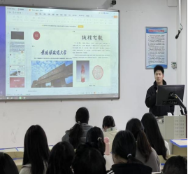 活动中,姜伊琪以“沉浸式感知校史”为核心展开宣讲,她首先带领在场学子共同观看学校宣传片,通过镜头感受学校在学术研究和文化传承等领域的发展成就与精神风貌;随后,她以时间为轴,带领同学们回溯校史——从19世纪末20世纪初中国陶业学堂到如今的陶瓷黄埔,清晰梳理百余年发展脉络,让“诚朴恕毅”的校训内涵从文字变为可感知的历史故事,激发学子以陶大为荣的深厚情怀;最后,全场学子起立共唱校歌,激昂的旋律与整齐的歌声交织,将爱校护校情感凝聚成强烈共鸣。