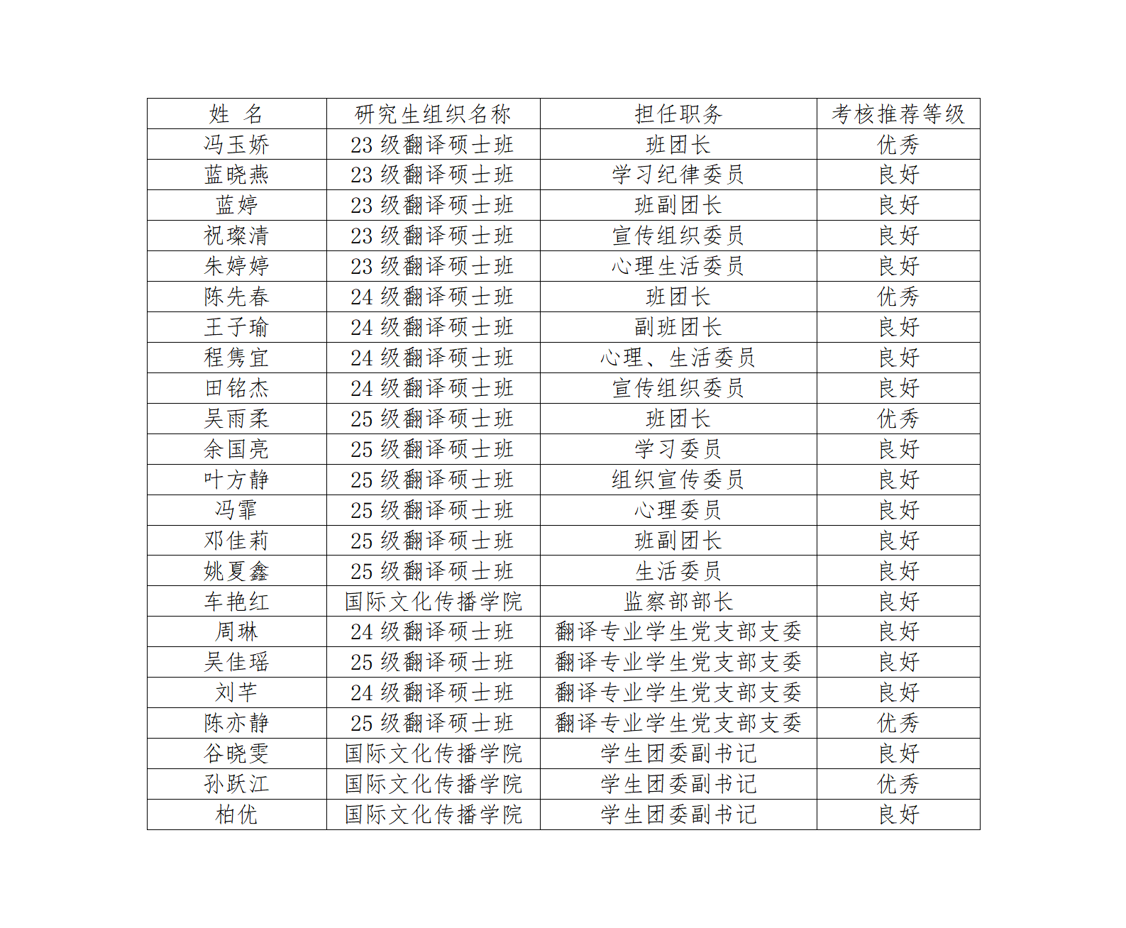 根据《景德镇陶瓷大学研究生奖学金管理办法》《景德镇陶瓷大学研究生奖学金计分办法》要求,本着“公开、公平、公正”的评选原则,经学生本人申请、国际文化传播学院学生工作办公室初审、学院党委讨论,现将各研究生干部考核结果予以公示,具体如下:
