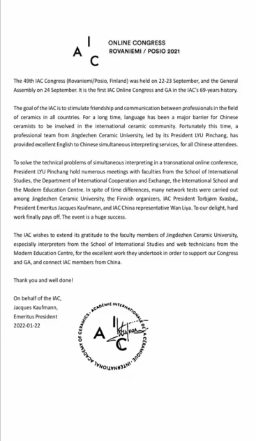 国际陶艺学会2021年会主办方致函感谢我院师生同传团队的优异表现